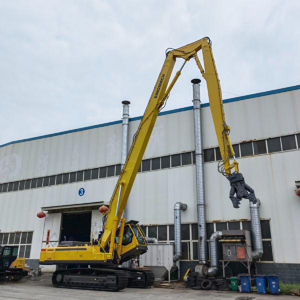 按其作業(yè)方式分為:拆樓式加長臂,深坑式加長臂,打樁式加長臂;按其段數(shù)分為:二段式加長臂,三段式加長臂,四段式加長臂;按其性能分為:固定式加長臂,滑移式加長臂,伸縮式加長臂等。三節(jié)拆樓臂主要適用于高層建筑拆遷。挖掘機(jī)三節(jié)臂配置液壓剪,破碎錘等作業(yè).
