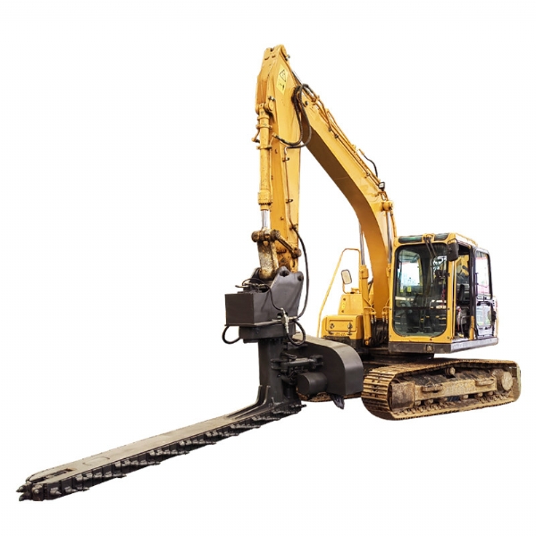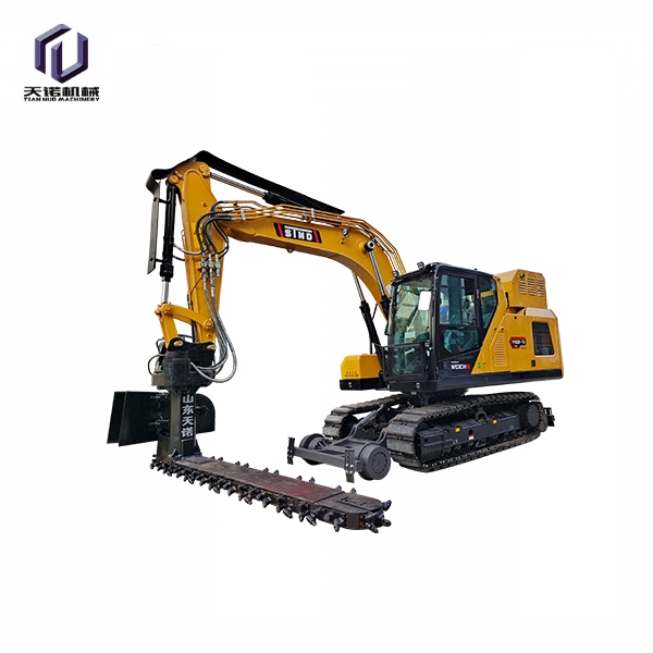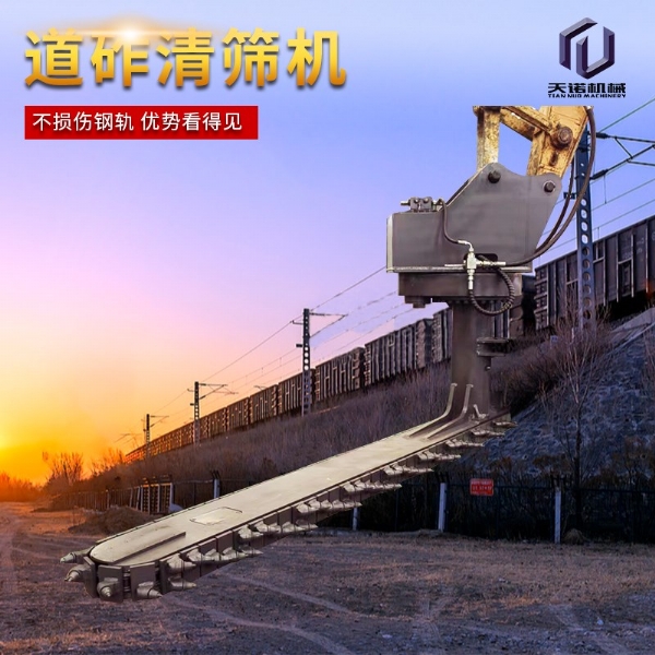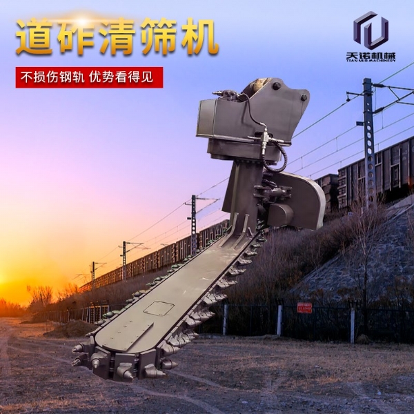 目前,鐵路交通發(fā)展迅速,對于年久的鐵路路基下面的石子需要定期更換,對于鐵路上的清渣機(jī)需要大型設(shè)備操作十分的不方面,采用人工又十分耗時,工作效率比較低下;為解決上述問題,克服現(xiàn)有技術(shù)的不足,天諾工程機(jī)械研發(fā)了一種能夠在狹小空間內(nèi)作業(yè)、操作簡單、效果高的鐵路清渣機(jī);鐵路清渣機(jī)包含扒渣鏈部、清渣板部、安裝部和連接部,安裝部設(shè)置在扒渣鏈部的上部,其用于與挖掘機(jī)連接;清渣板部設(shè)置在扒渣鏈部的尾端,清渣板部和扒渣鏈部通過連接部相連;扒渣鏈部包括鏈條,鏈條由若干首尾相連的鏈節(jié)組成,鏈節(jié)包括支座和設(shè)置在支座上的截齒;若干截齒呈波浪式陣列布置;安裝部包括上座板和下座板,上座板和下座板之間設(shè)置有回轉(zhuǎn)支承,上座板上部設(shè)置有兩個相互平行的大耳板。鐵路清渣機(jī)是為鐵路道咋清理而設(shè)計的一款鐵路專用屬具,鏈條式道咋清理機(jī)需安裝在150挖掘機(jī)前端,并從軌道外側(cè)位置清理,通過大扭矩馬達(dá)帶動免維護(hù)鏈條上作業(yè)鏈條上裝置超耐磨的合金屬具對道床道砟進(jìn)行連續(xù)清理的技術(shù),排列使得道砟的清理及更換更加簡單高 效,提高了施工速度同時節(jié)省了勞動力。